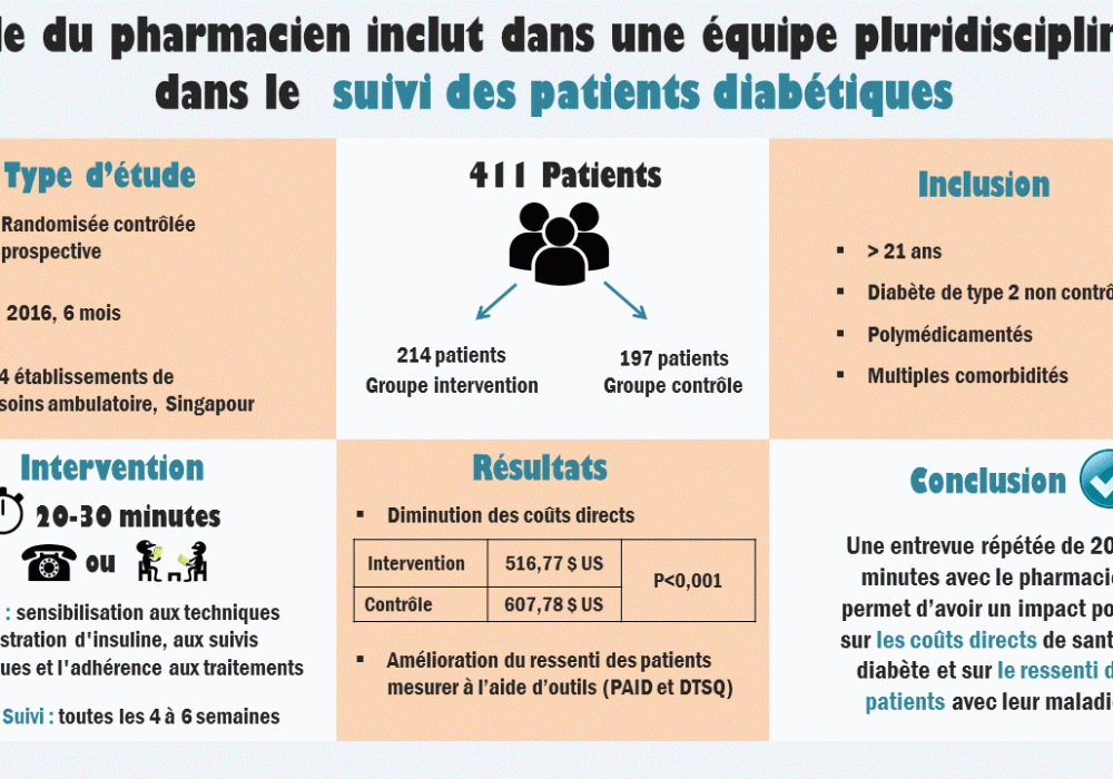 - Les rôles et les retombées du pharmacien dans la prise en charge des patients diabétiques sont bien documentés. Nous avons recensés plusieurs études ayant démontré que l’intervention du pharmacien améliore le ressenti de la maladie des patients diabétiques : PMID25789518, PMID23848476, PMID21335480.