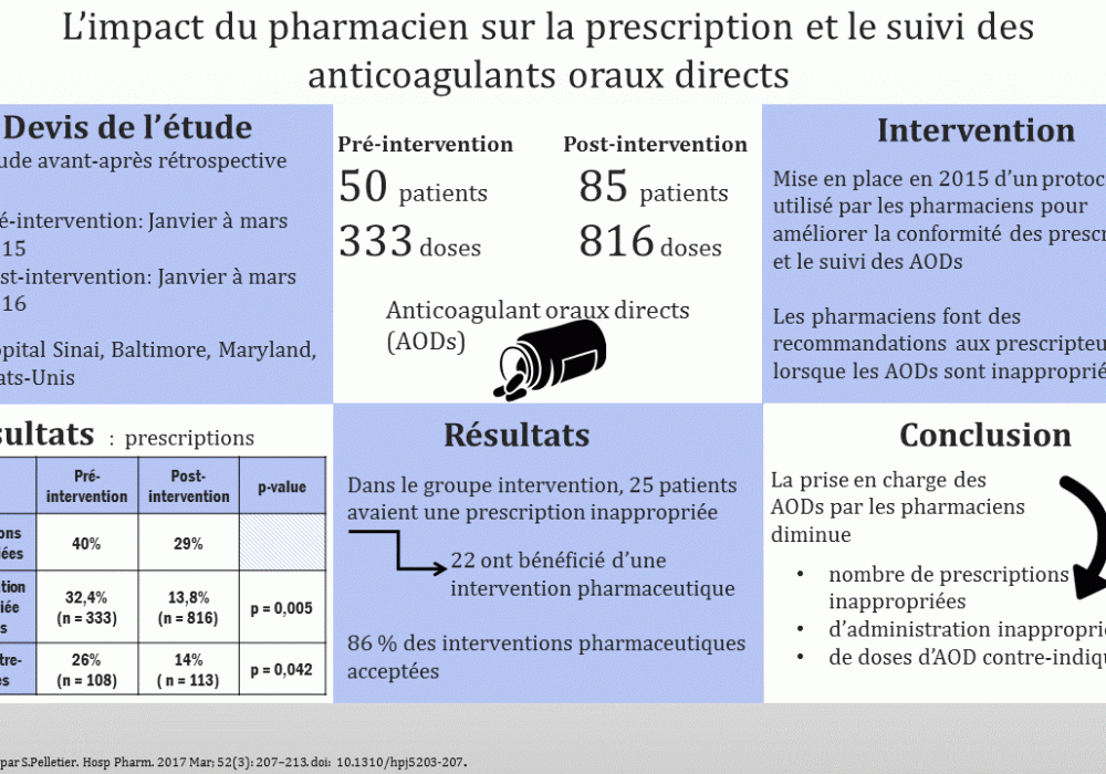- L’objectif consiste à évaluer l’impact d’un protocole utilisé par les pharmaciens développé en décembre 2015 pour améliorer la conformité des prescriptions et le suivi des anticoagulants oraux directs (AODs).