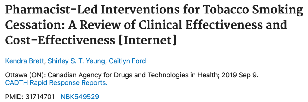- Une revue systématique de très faible qualité a effectué une analyse coût-efficacité concernant les interventions dirigées par les pharmaciens pour cesser de fumer : en général, les interventions dirigées par des pharmaciens étaient considéré coût-efficace.