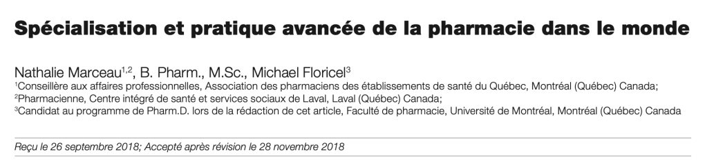 Pour en savoir plus: Marceau N, Floricel M. Spécialisation et pratique avancée de la pharmacie dans le monde. Pharmactuel. 2019;52(1) : 41-49.