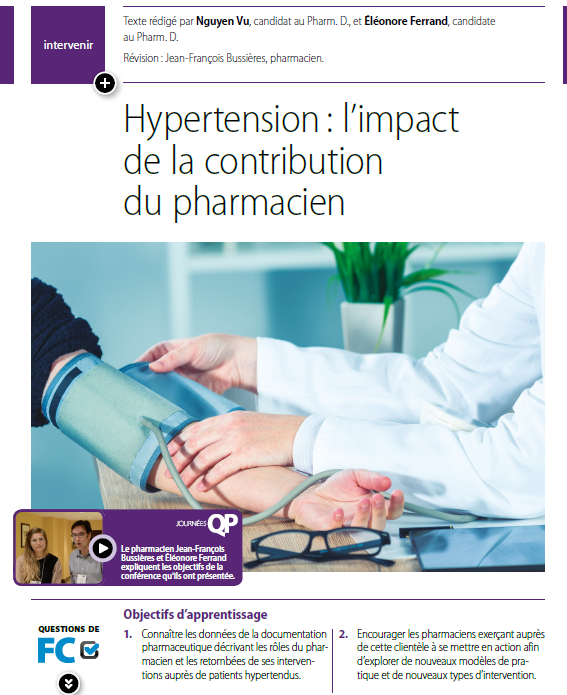 - Consultez la première chronique Intervenir publiée dans Québec Pharmacie en juin 2017 qui présente une revue systématique de Cheema et coll. sur les meilleures données relatives aux rôles du pharmacien et aux retombées de ses interventions sur la prise en charge de l’hypertension artérielle.