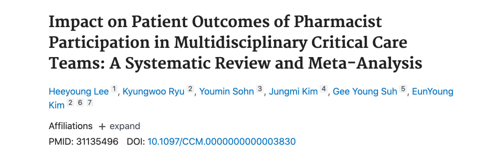 Objectif : Évaluer les effets de l’inclusion d’un pharmacien à l’équipe multidisciplinaire des soins intensifs sur les résultats cliniques y compris la mortalité, la durée du séjour aux soins intensifs et les événements indésirables liés aux médicaments.