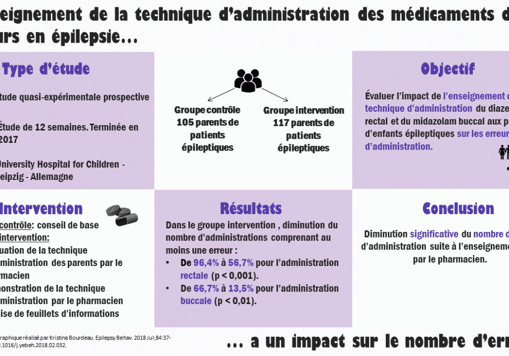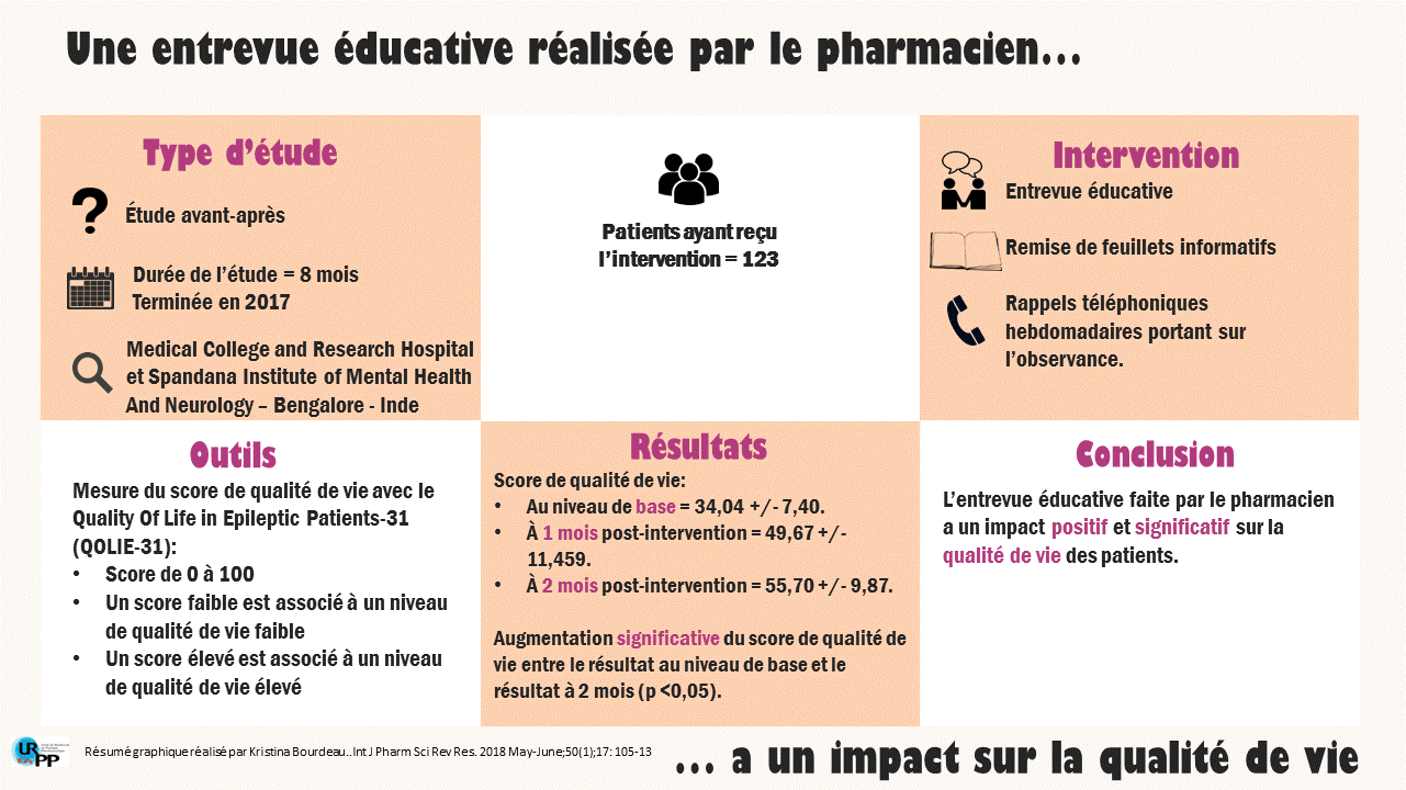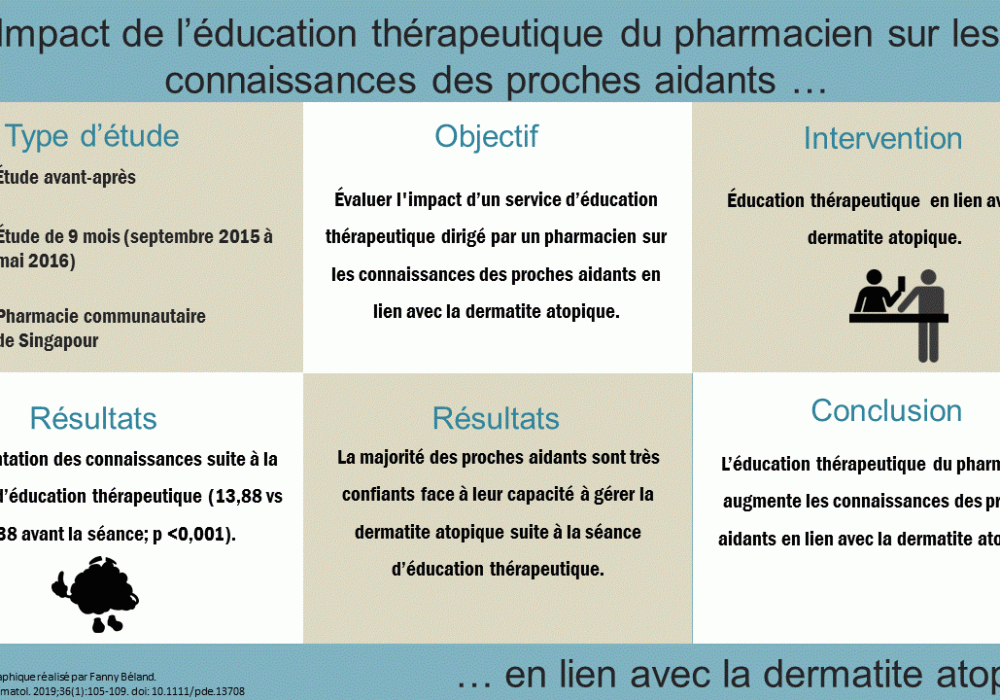 - Activité : Conseils aux patients – individuels; Éducation thérapeutique; Enseignement à l’extérieur du département de pharmacie; Évaluer la pharmacothérapie; Évaluation de l’utilisation des médicaments; Risques et prévention; Surveillance de la pharmacothérapie (tests de lab); Vigilance et effets indésirables.