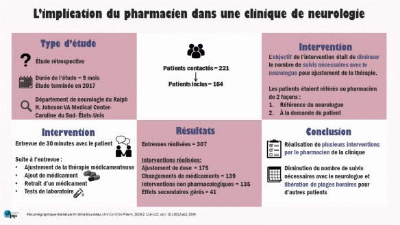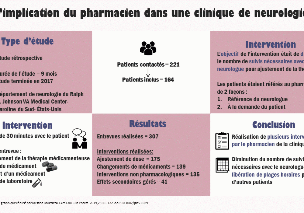 - Échantillon de 442 patients impliquant 494 pharmaciens communautaires entre novembre 2010 et octobre 2012. L’intervention du pharmacien a duré 12 mois.