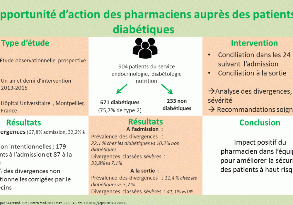 - On peut consulter le site Impact Pharmacie et la fiche synthèse sur la conciliation médicamenteuse à l’entrée, à la sortie et la fiche synthèse du diabète