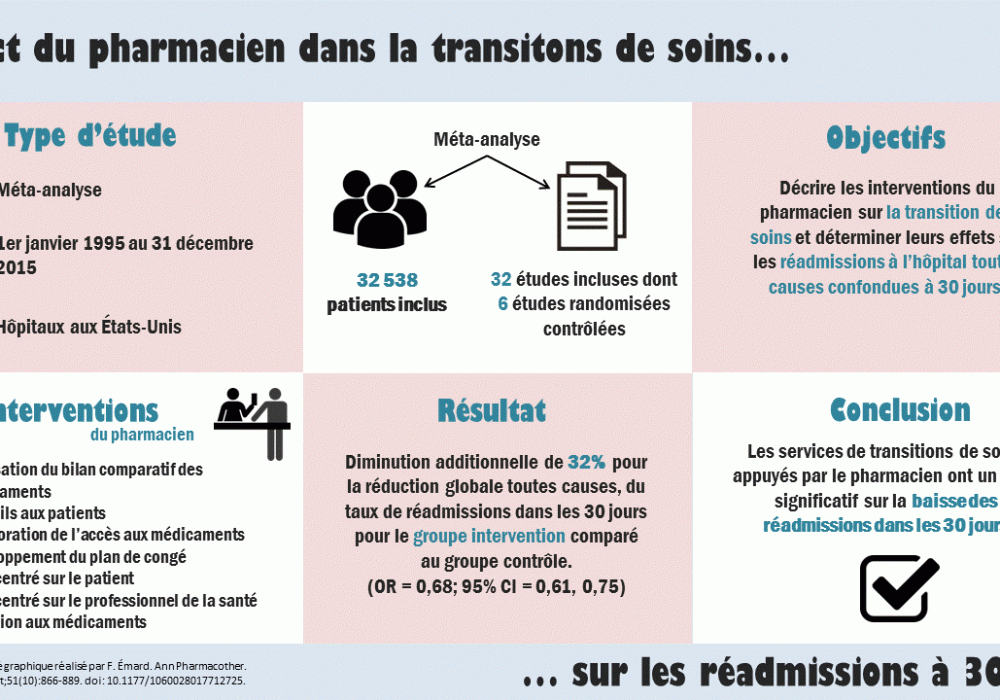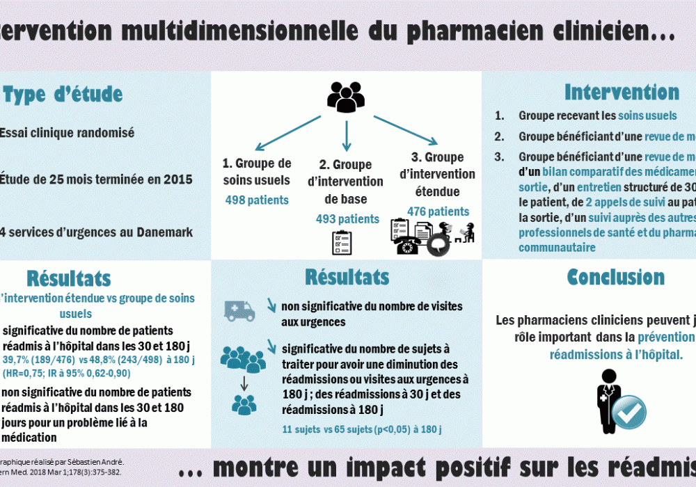 - Aucune intervention pharmaceutique n’était réalisée dans le groupe contrôle. L’intervention pharmaceutique de base consistait en la réalisation d’un bilan comparatif de médicaments à l’arrivée et au congé du patient accompagnés de conseils individuels aux patients. L’intervention pharmaceutique soutenue, en plus de l’activité de base incluait la communication au médecin généraliste et au pharmacien communautaire d’une liste des médicaments pris à la sortie par le patient