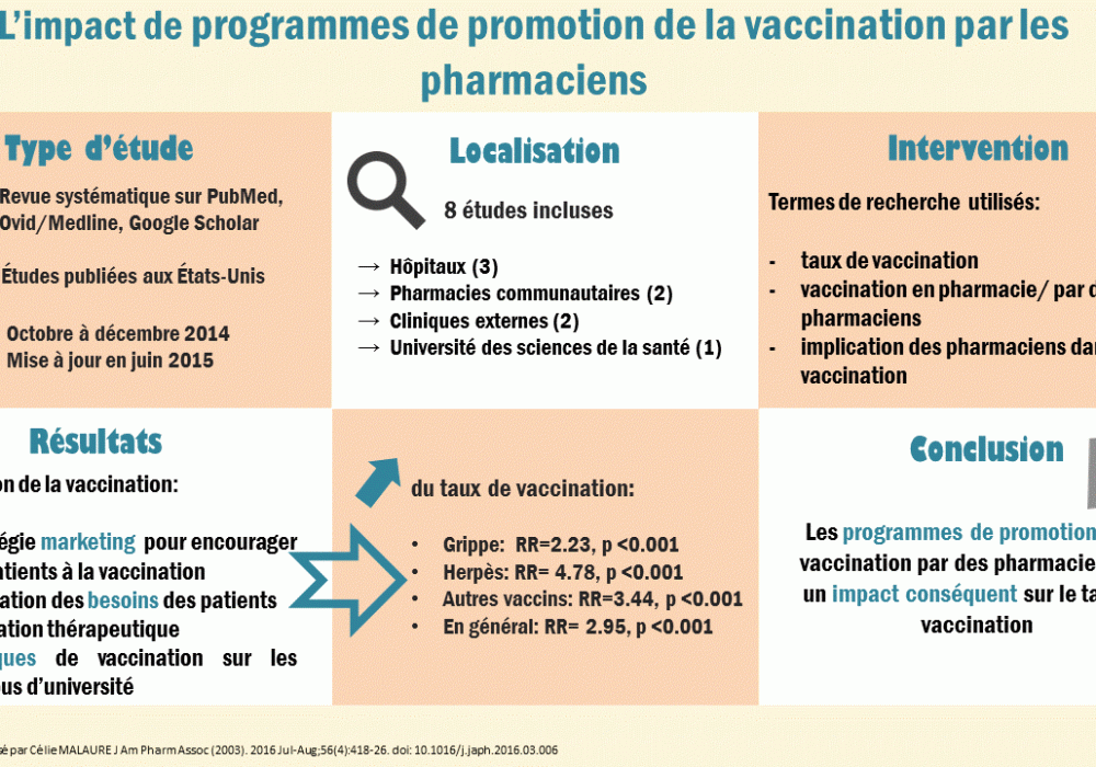 - L’objectif était de comparer des programmes de promotion active de la vaccination par les pharmaciens par rapport aux soins usuels de vaccination dispensés par les pharmaciens.